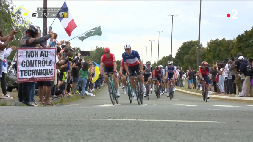 Deux groupes de bénévoles ont déployé leurs banderoles sur le parcours du tour, l’une d’entre elle a eu le plaisir d’être diffusée sur le direct de France 2.